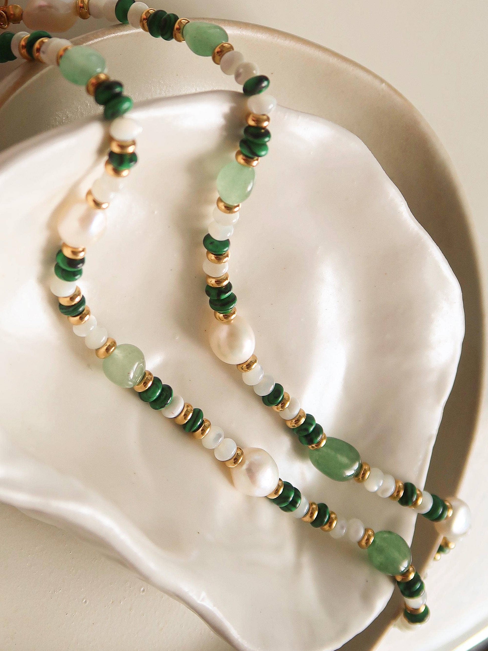 18K Bohemian Rose, Green Pearl and Bead Necklace