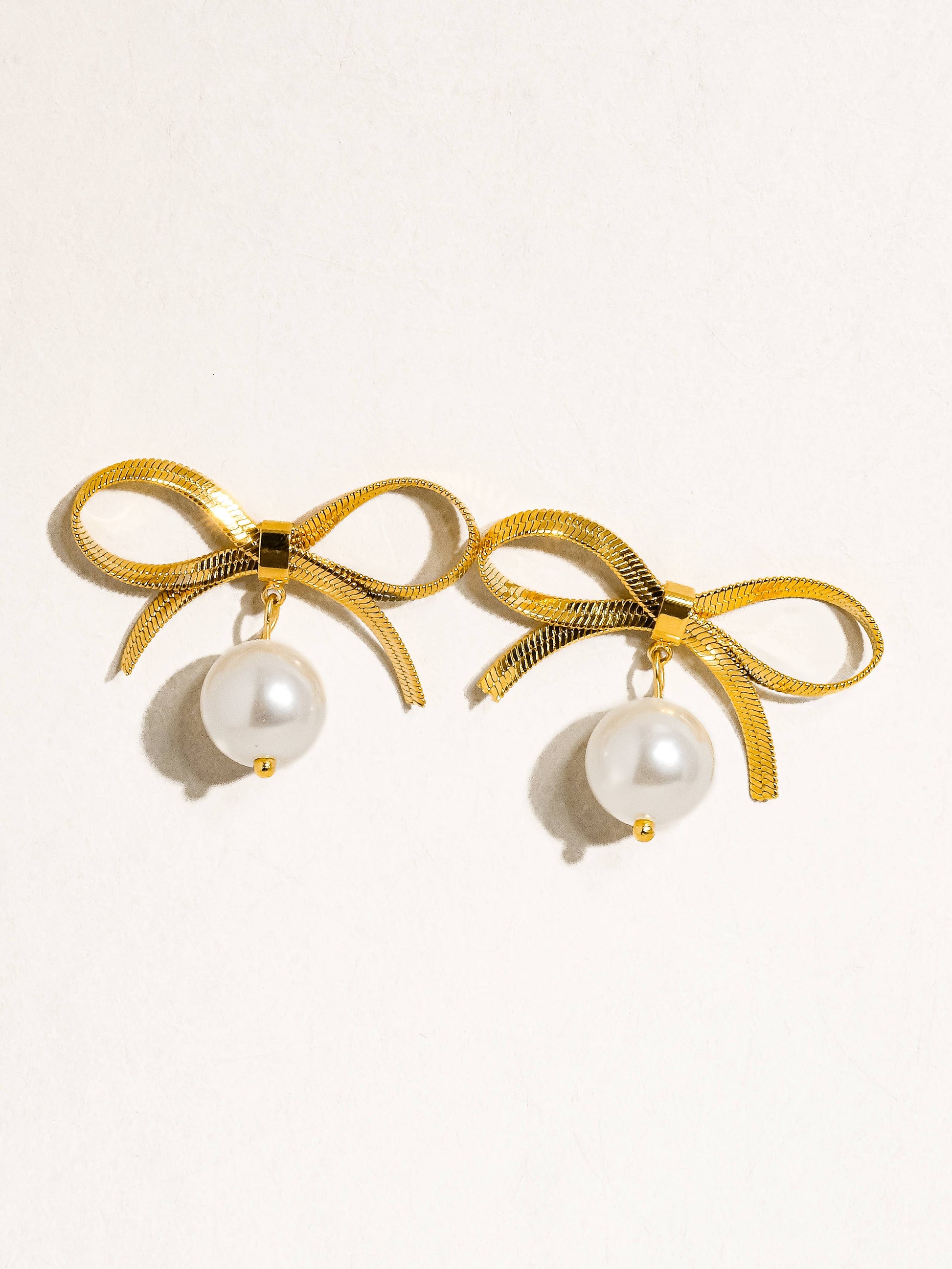 18K Gold Non-Tarnish Bow Dangle Pearl Earring