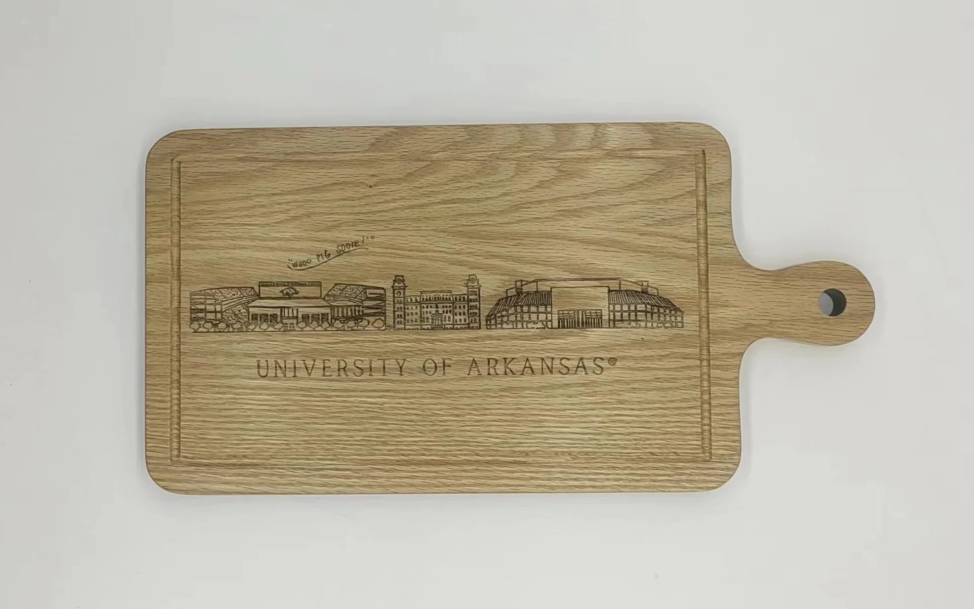 Show your school spirit with the Arkansas Skyline Charcuterie Board. Featuring our signature skyline artwork, etched into a gorgeous, wood charcuterie board. This makes the perfect serving dish for tailgates, parties, and the holidays.