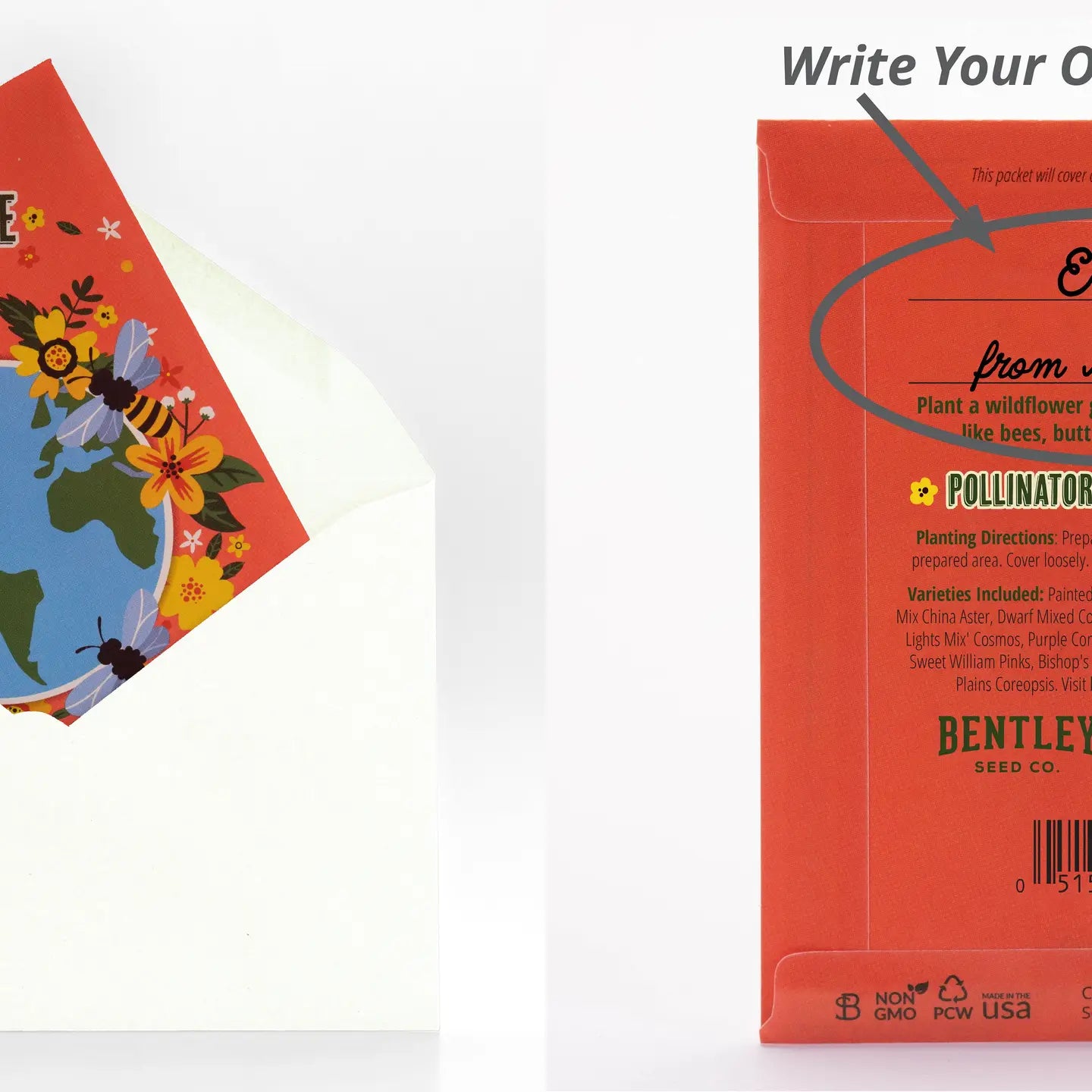 Our exclusive orange “Bee the Change” packets are the perfect call to action for any event or as a handout for clients, customers, co-workers, teachers, students, friends, and family. The packet design illustrates the earth, honey bees, and yellow flowers. Honeybees and other bee species, along with big and small pollinators, are suffering globally. You can help by making an impact right in your own backyard. Each packet grows a wildflower garden that will provide food and habitat to bees, butterflies, birds, and other winged creatures. Use the space provided on the back of the packet to write your own personalized message, or even place a label sticker with your preprinted logo and contact info on it! This packet will cover approximately 10 square feet of space.