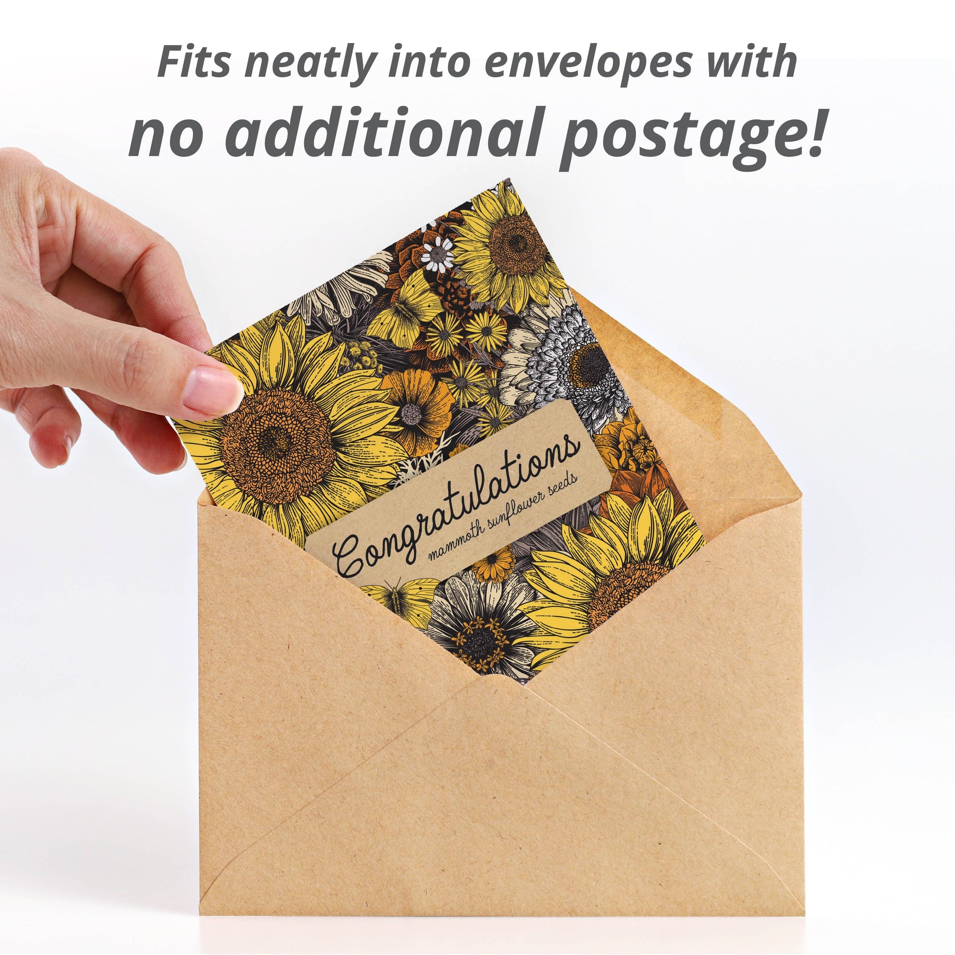 Long considered a celebration flower, sunflowers are popular in wedding, anniversary, and graduation bouquets. A beautifully illustrated “Congratulations” packet is a uniquely different way to say “Cheers!”. These Mammoth Sunflower seeds grow up to 12’ tall with big, bold blooms, making them a memorable reminder of your best wishes. Congratulations Warm Mammoth Sunflower Seed Packet cards feature a warm autumn color palette with gold, yellow, and orange tones.