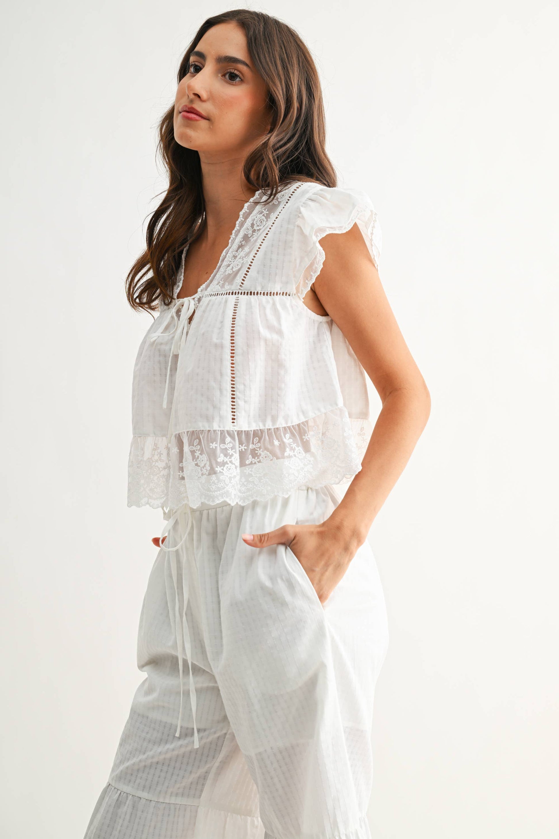 This elegant lace-trimmed blouse combines delicate embroidery with soft, breathable fabric to keep you looking stylish and feeling comfortable. The intricate lace details create a sophisticated appearance, perfect for enhancing your wardrobe. The tie-front design adds a feminine touch, making it suitable for both casual and more polished occasions.