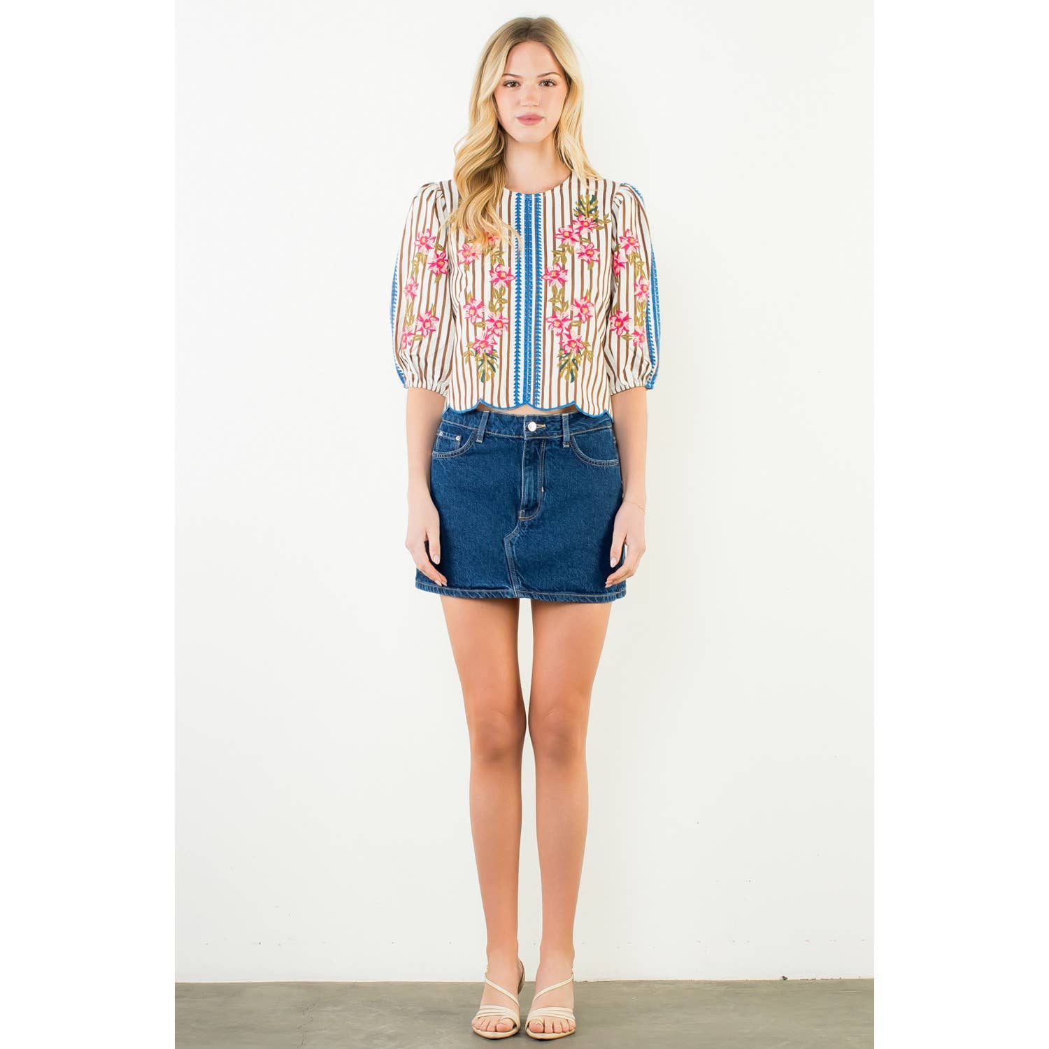 Puff Sleeve Striped Embroidery Detail Top
