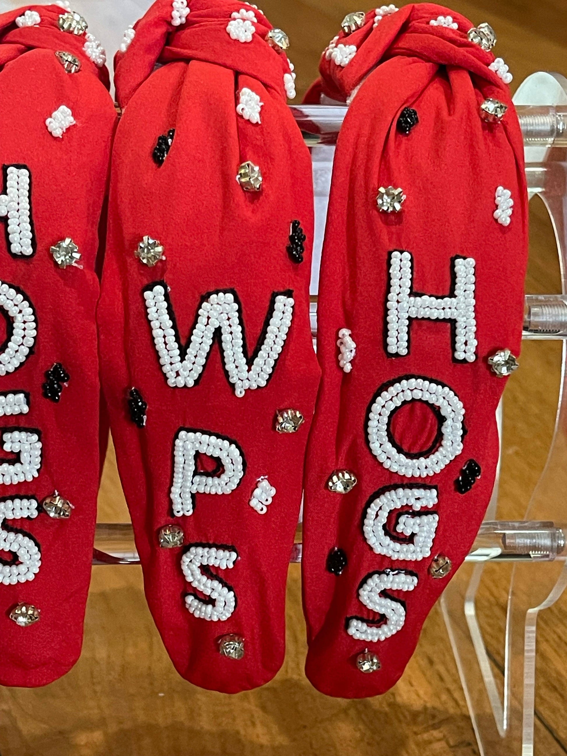 This red headband features WPS on one side and Hogs on the other side in beads.