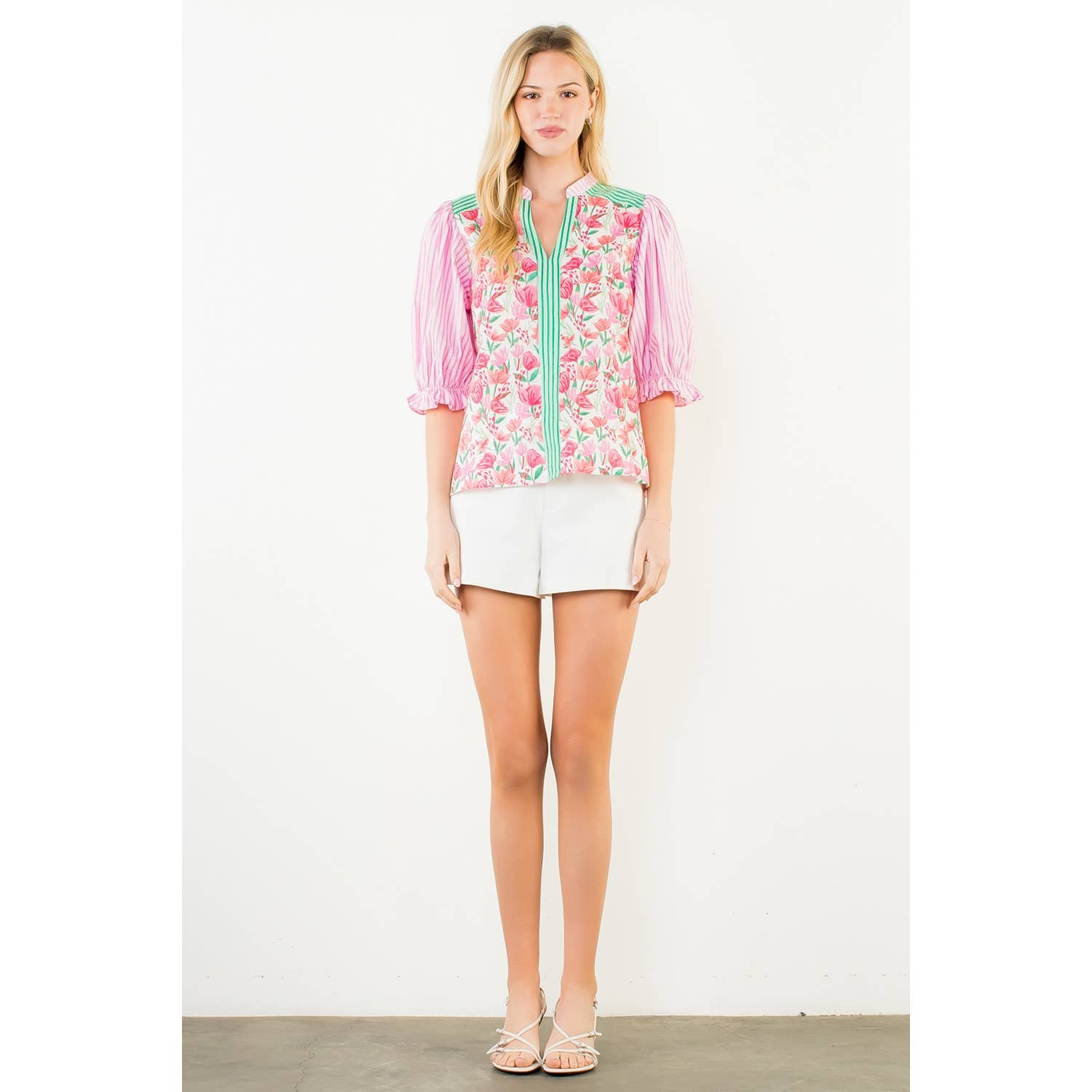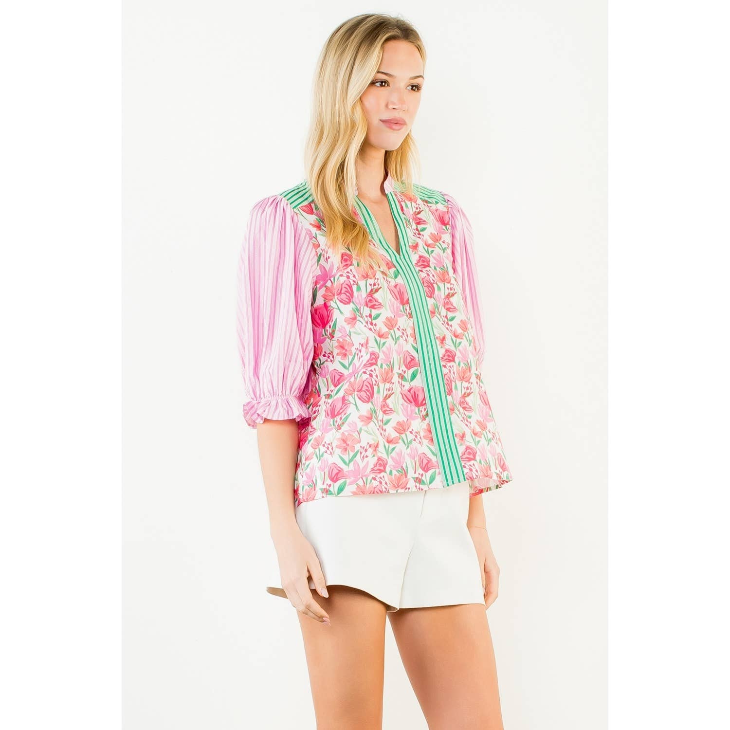 Short Sleeve Mixed Media V-Neck Top