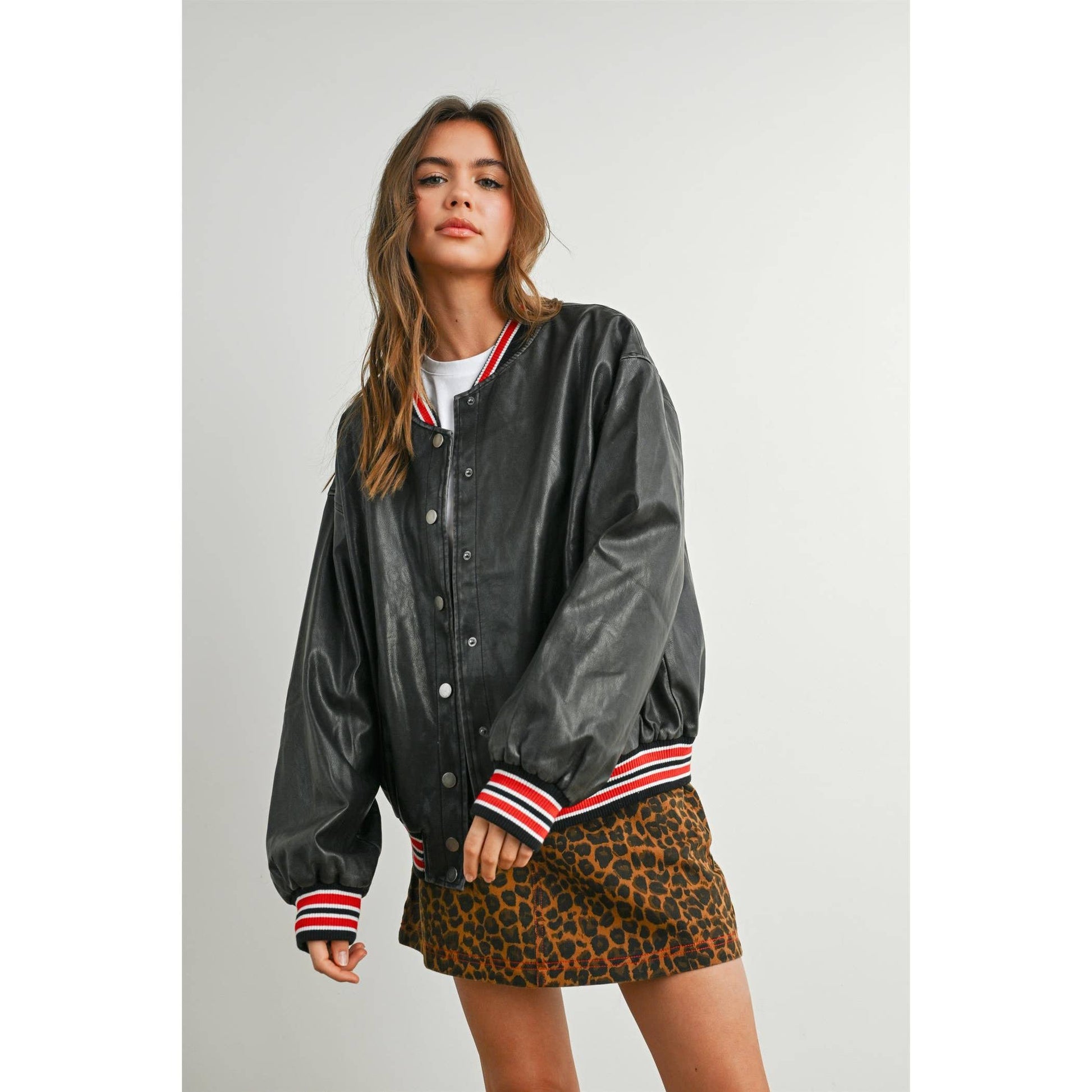Channel classic athletic style with this snap-button varsity bomber jacket. Featuring contrast trim, a snap-button front, and a timeless bomber silhouette, it adds a sporty edge to any outfit. The structured fit and soft interior make it both stylish and comfortable—perfect for everyday wear.
